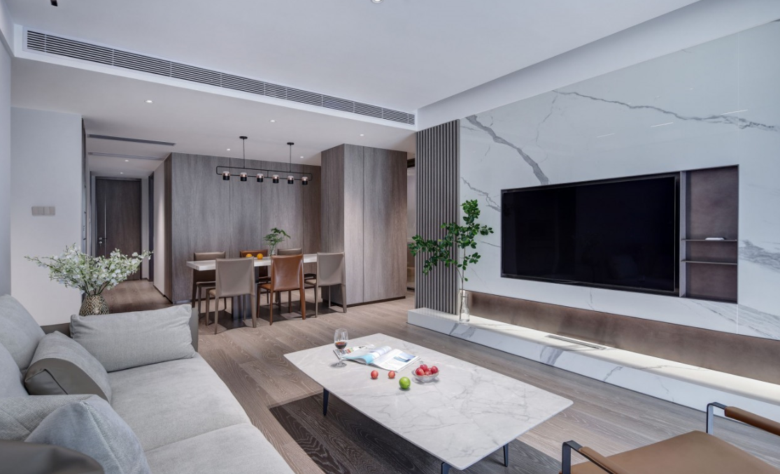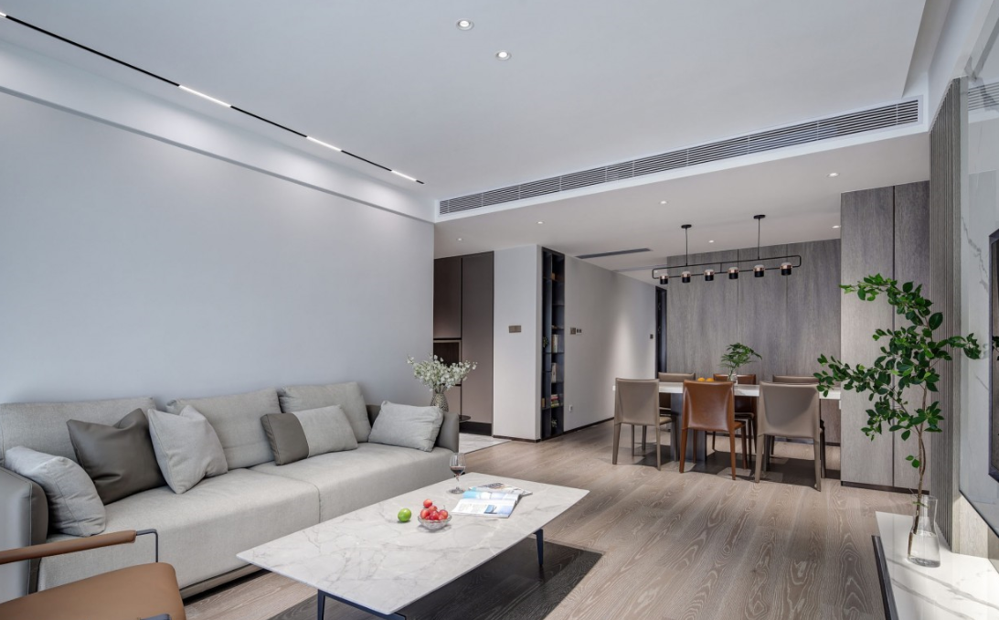 采用明亮而不眩目的無主燈設(shè)計(jì),筒燈與磁吸燈簡(jiǎn)約靈活的泛光照明,電視背景墻下隱藏?zé)魩У男Ч麪I(yíng)造優(yōu)化了空間形體以及局部的明暗關(guān)系。