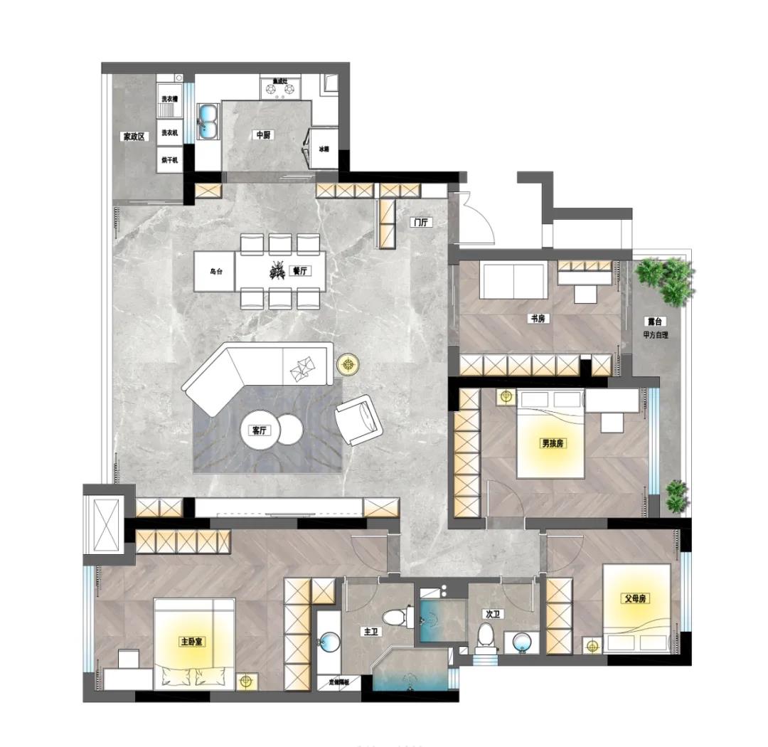 本案設(shè)計(jì)入戶門廳即可以達(dá)到私密獨(dú)立性,又可以讓整體空間大氣端莊,吊頂是無主燈的設(shè)計(jì)手法打造,主臥室以及兒童房的收納柜與學(xué)習(xí)功能得到了最大化,主衛(wèi),次衛(wèi)空間考慮到干濕區(qū)分明,實(shí)現(xiàn)了客戶對新房的所有需求。