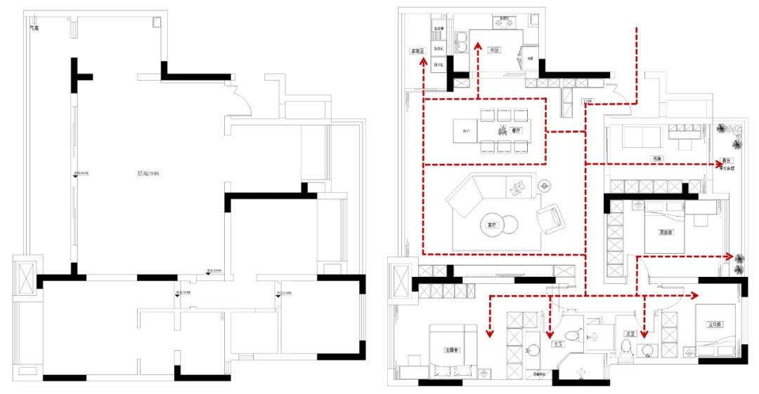 本案例中,常住人口是祖孫三輩5人,空間規(guī)劃上,客戶有比較大的收納需求。在充分了解客戶喜愛的設(shè)計(jì)風(fēng)格與需求后,設(shè)計(jì)師結(jié)合實(shí)際戶型,將一個輕奢又溫柔的家居空間呈現(xiàn)在我們面前。