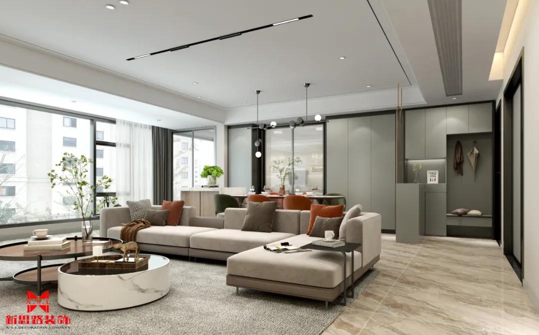 客廳采用無主燈設(shè)計(jì),線條磁吸燈造型流暢動感又富有藝術(shù)氣息。接近落地的玻璃窗起到了極佳的采光作用,配合柔和的室內(nèi)光源與布藝沙發(fā),為空間增添不少溫馨感。