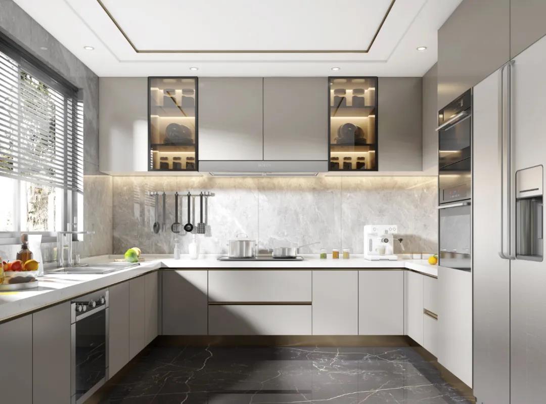 廚房主色調(diào)采用灰白色,讓空間看起來更加干凈溫柔。吸頂式的抽油煙機(jī)相較傳統(tǒng)油煙機(jī)來說造型更為流暢,智能化烹飪設(shè)備齊全,滿足客戶一家的多樣化烹飪需求。
