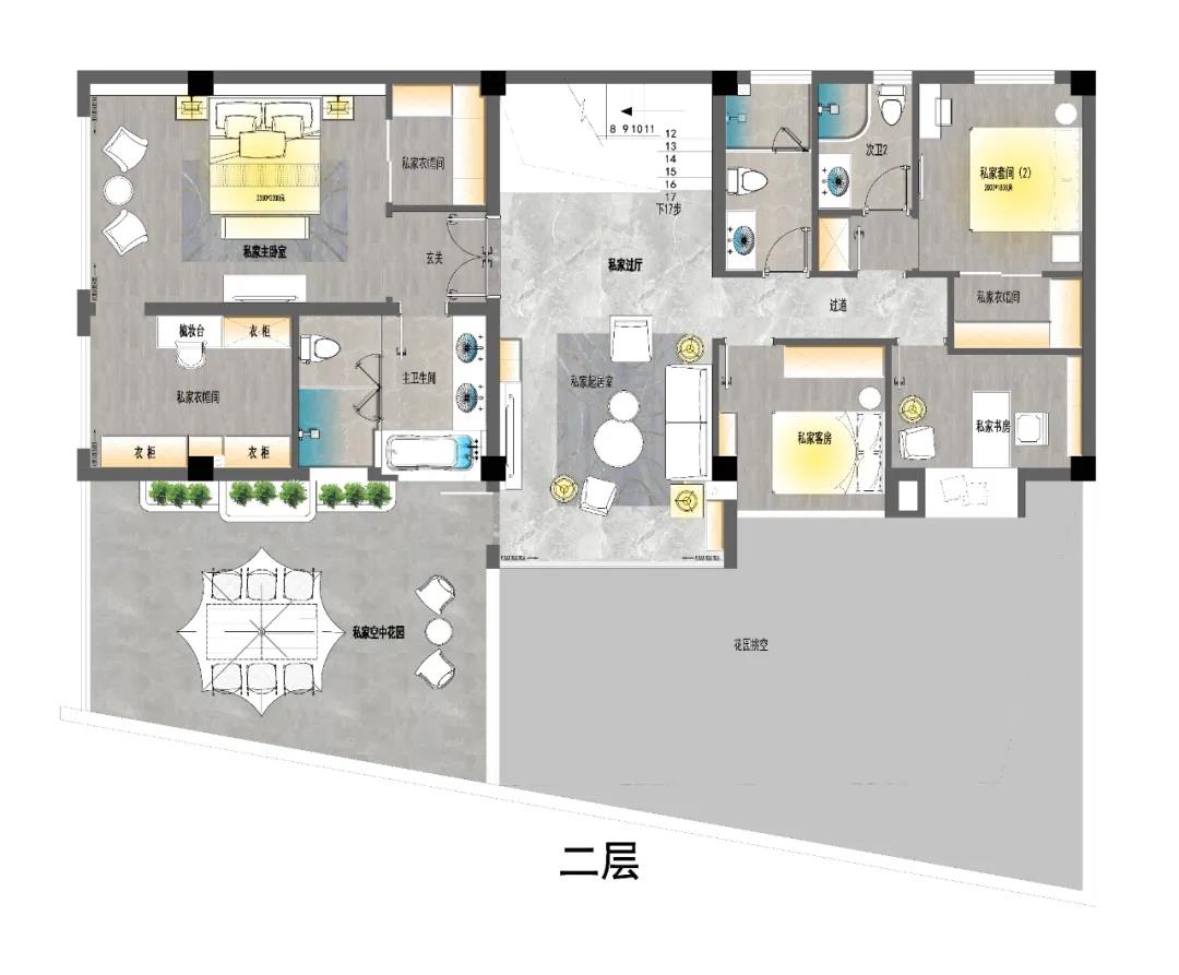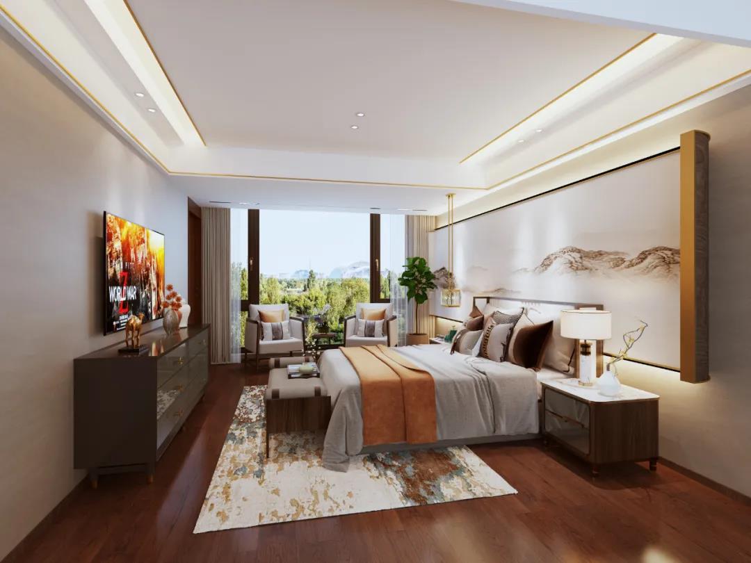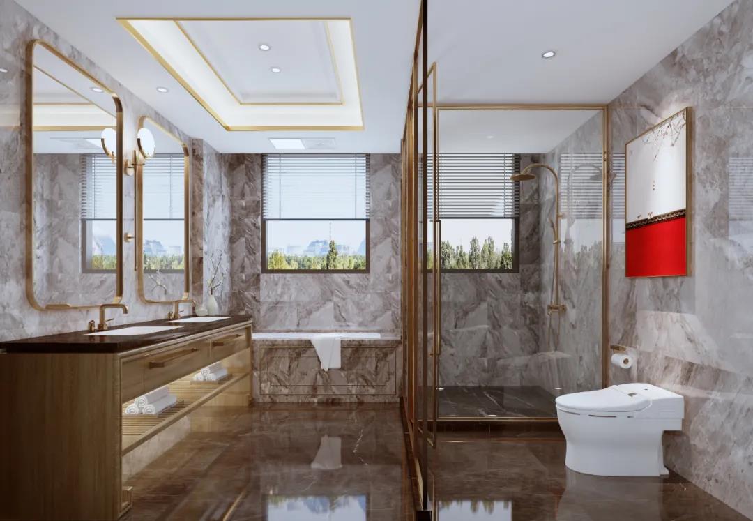 主衛(wèi)采用雙臺盆的設(shè)計,方便主人進行梳洗打扮。浴缸、淋浴間、馬桶均單獨隔開,盡可能減少衛(wèi)生間的積水情況,保持衛(wèi)生間的清潔,方便打掃,也是為了健康。除此之外,衛(wèi)生間的裝潢均采用黃銅金屬、大理石花紋,打造出奢華之感。