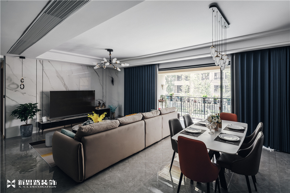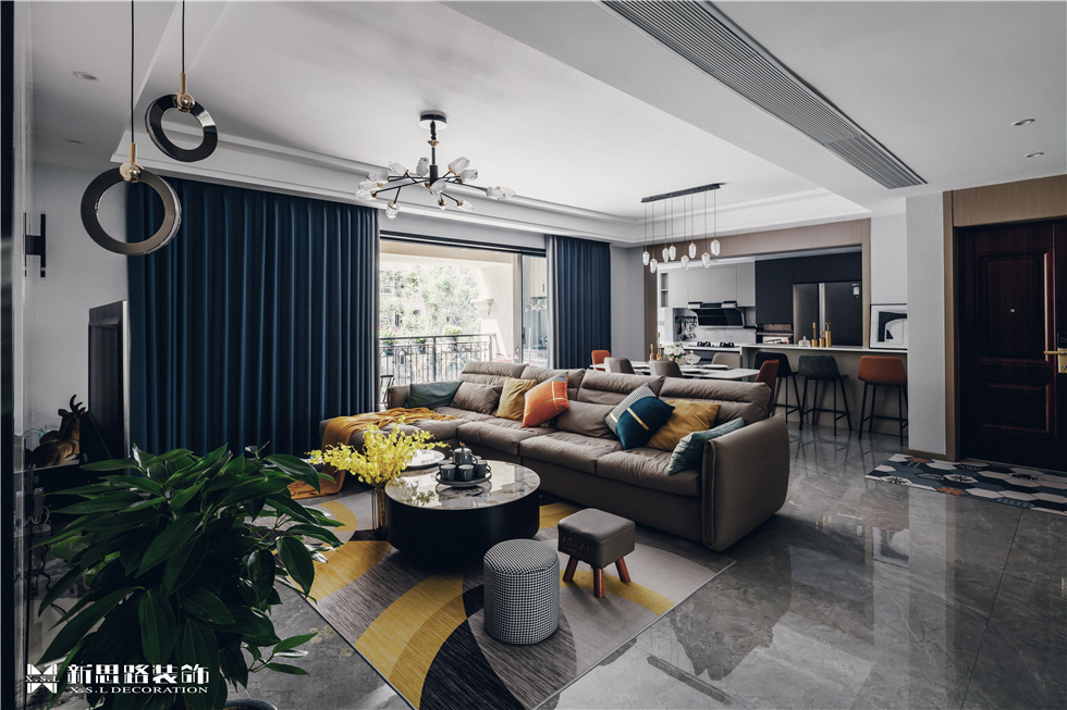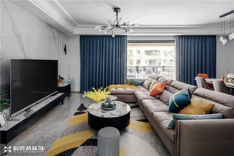 客廳的色彩搭配上選擇撞色設(shè)計,淺色系的白、淺棕、灰,深色系的黑、深棕、藏青,還有冷色系和姜黃、深橘色等暖色系的相碰,為空間增添了不少活力和生機。大理石紋理的電視墻與茶幾、電視柜在低調(diào)中又透出一絲奢華之感,沙發(fā)選用科技布材質(zhì),更加柔軟舒適,忙碌一天回到家后于此小坐,能得到更好的休息與放松