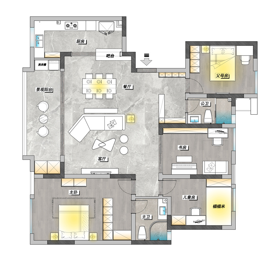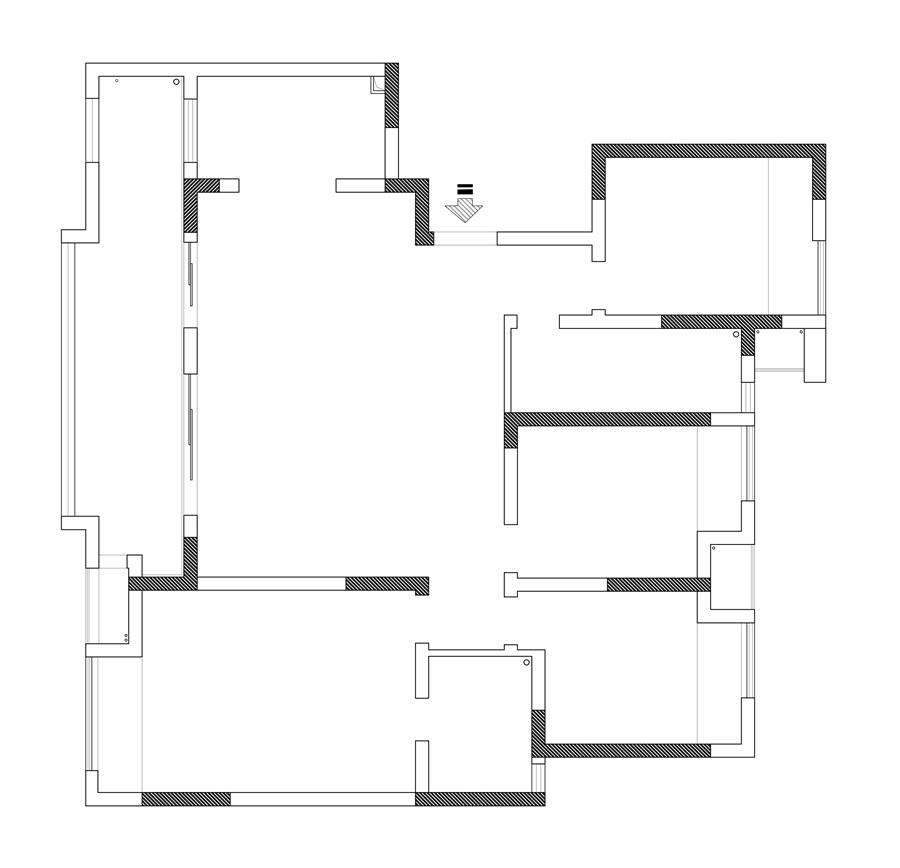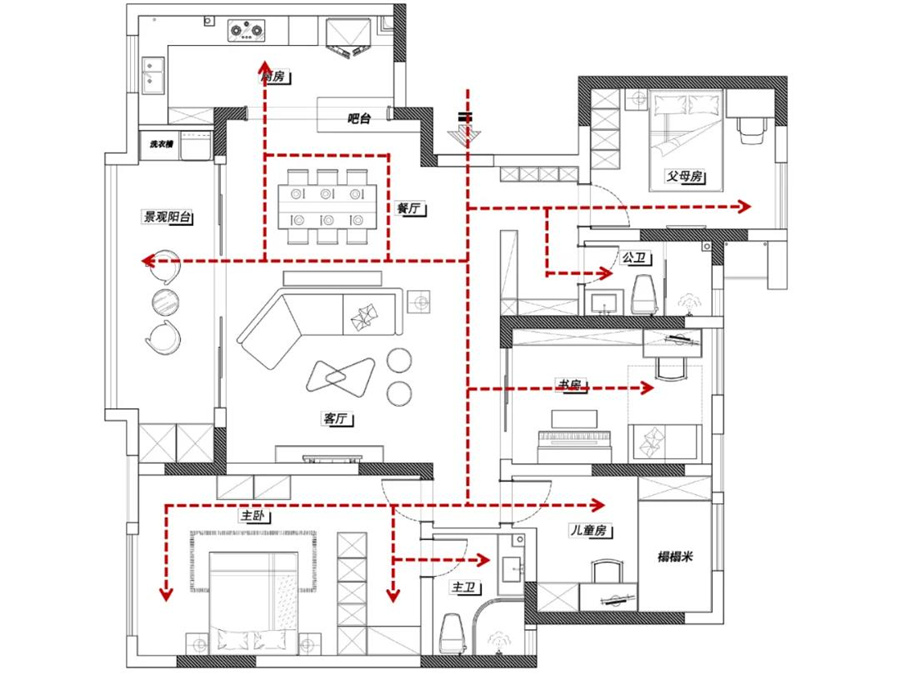 原始結(jié)構(gòu)圖 平面布置動線圖 設(shè)計平面布置圖 玄關(guān)放置換鞋凳,家中老人進(jìn)出換鞋更方便。一旁的小吧臺能很好地起到隔斷作用,將父母房和衛(wèi)生間隔開,使精簡功能分區(qū)更明確。吧臺