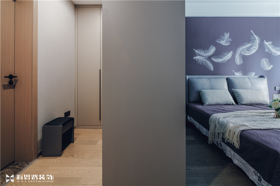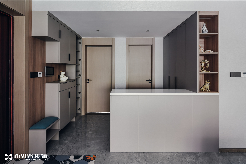 玄關(guān)放置換鞋凳,家中老人進(jìn)出換鞋更方便。一旁的小吧臺能很好地起到隔斷作用,將父母房和衛(wèi)生間隔開,使精簡功能分區(qū)更明確。吧臺上可放置物品,下方的柜體也能增加儲物空間,十分實用。