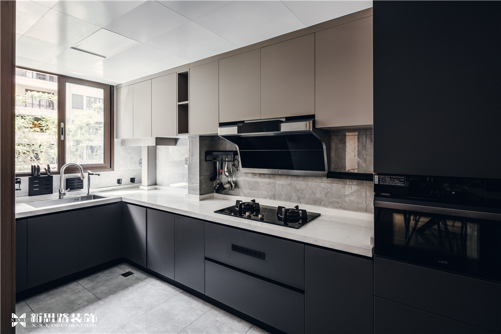 廚房柜體顏色使用深灰和卡其色,造型方正、線條感強,點明現(xiàn)代風(fēng)格的主題。操作臺沿墻面排布,灶臺、料理臺、水盆等區(qū)域劃分明確,便于整理和打掃。配備超強吸力的油煙機,即使是開放式廚房也不用擔(dān)心爆炒等猛火烹飪帶來的油煙。