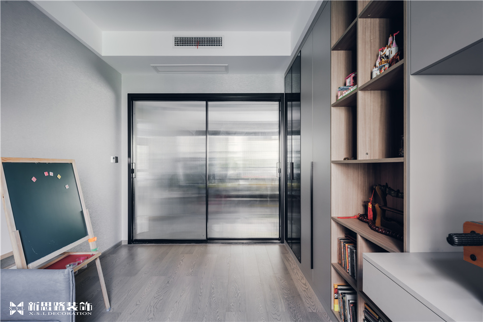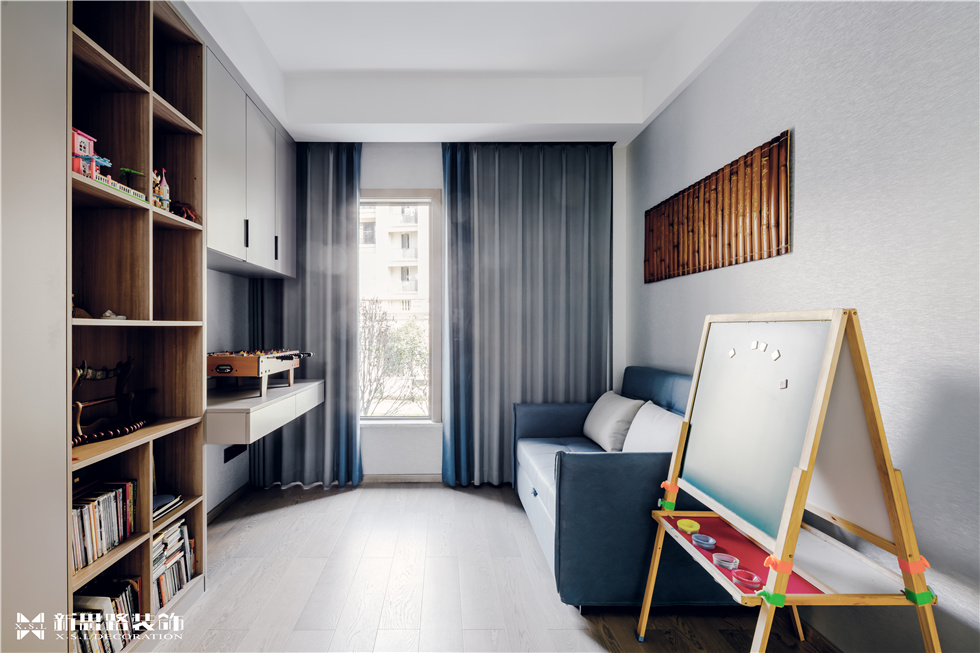靠近客廳的房間改造成為獨立多功能房,打開門后即可和客廳連為一體,起到間接為客廳分擔(dān)部分功能的作用。既能作為休閑娛樂、客人下榻的場所,也能作為書房使用,滿足了客戶想擁有一個安靜閱讀、工作和學(xué)習(xí)環(huán)境的需求。超大的書柜作為書籍、玩具、擺件的收納之處非常不錯,書桌臨近窗戶,優(yōu)秀采光更加護(hù)眼。