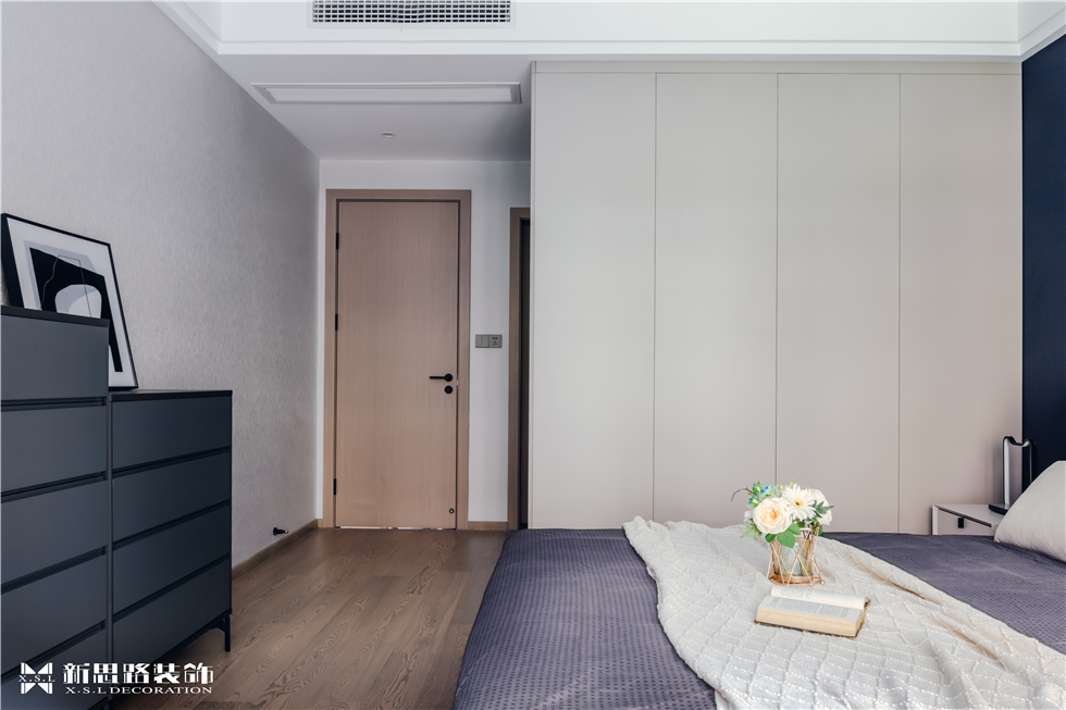 主臥由臥室、衣帽間和主衛(wèi)三個部分構(gòu)成,超多柜體的設(shè)計讓收納不再成為煩惱。整體選擇盡量簡約和減少配飾的設(shè)計思路,力求減輕累贅和繁復(fù)感。在配色上,選擇了藏青色和白色的搭配,更深沉穩(wěn)重、有格調(diào),再點綴一抹橙色,空間氣氛不會顯得沉悶。臨近窗戶的位置增添一張沙發(fā),可坐可躺,是個放松和休息的不錯選擇。