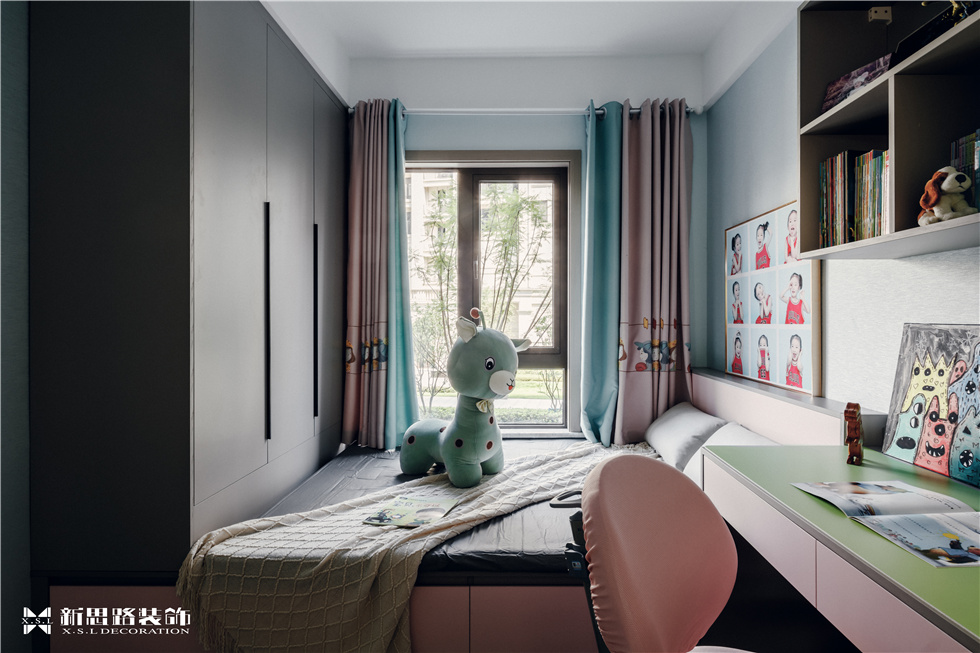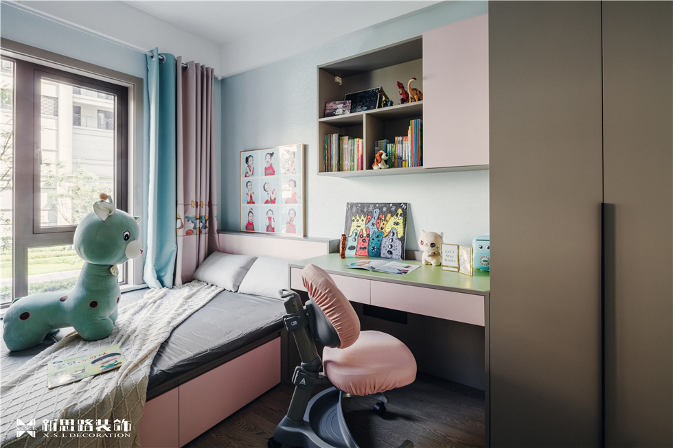 兒童房色調(diào)以小女孩喜歡的藍(lán)、粉為主,配以各種卡通裝飾,童趣活潑。床鋪做成了榻榻米的形式,滿足孩子成長時不斷增加的收納需求。獨立的懸掛書柜,不僅能放下孩子喜歡的圖書,小女孩珍藏的小恐龍等擺件和玩偶也有了自己的“住處”。