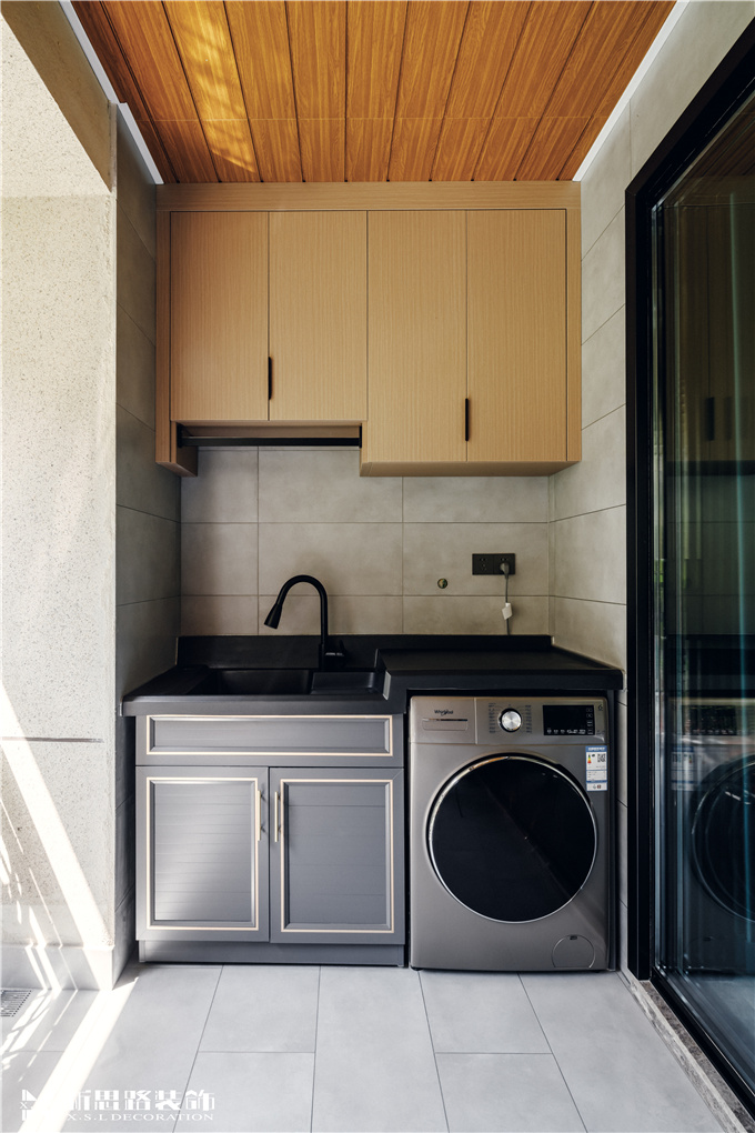 陽臺功能為休閑、洗衣和晾曬區(qū)。大面積向陽晾曬區(qū)滿足一家五口的需求,獨立于衛(wèi)生間的洗衣區(qū)配備洗衣槽,更符合老人的生活習(xí)慣。上方衣架收納桿實用又方便,即取即用。