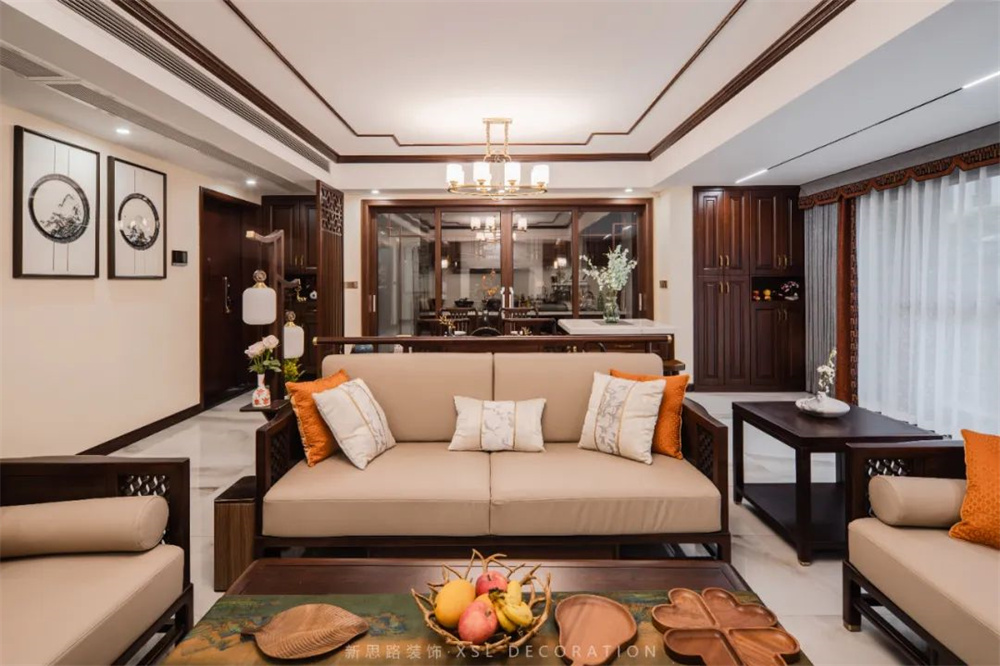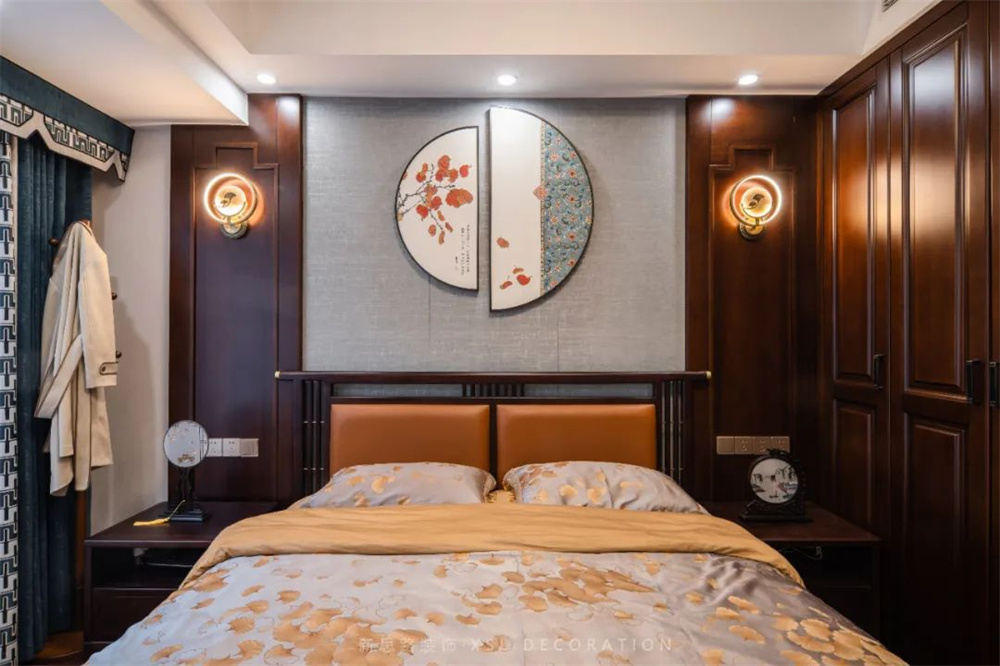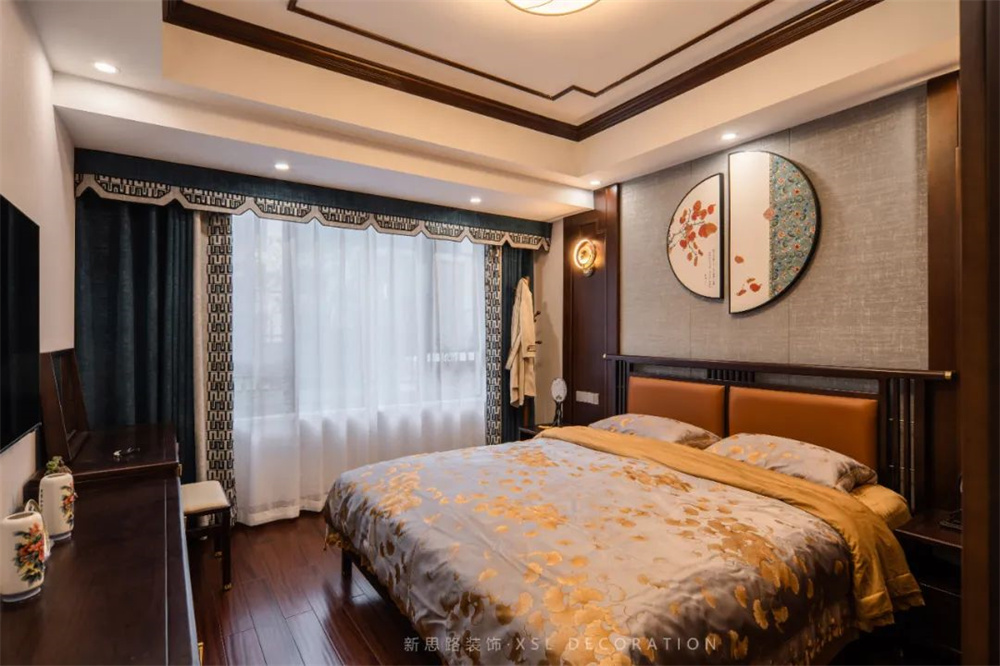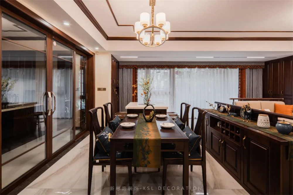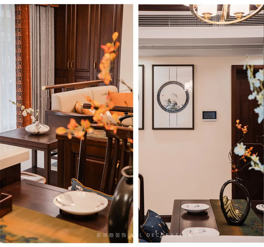 入戶玄關(guān)的視覺點(diǎn)用景和物做隔斷,半開半合中將視線引向內(nèi)部空間,餐廳使用木色與廚房空間氛圍為一體,餐桌上采用“清明上河圖”布飾加以山水瓶插花營造出大氣氛圍;暖色微醺的光源散漫折射照其上,撩撥平靜的心緒,蕩起一絲漣漪。明亮色彩的碰撞,傳遞中式意蘊(yùn)及趣味的同時(shí),激活味蕾的感知;絲綢布藝與盤扣的細(xì)節(jié)點(diǎn)綴,調(diào)和深木色的沉悶印象,內(nèi)斂延綿。
