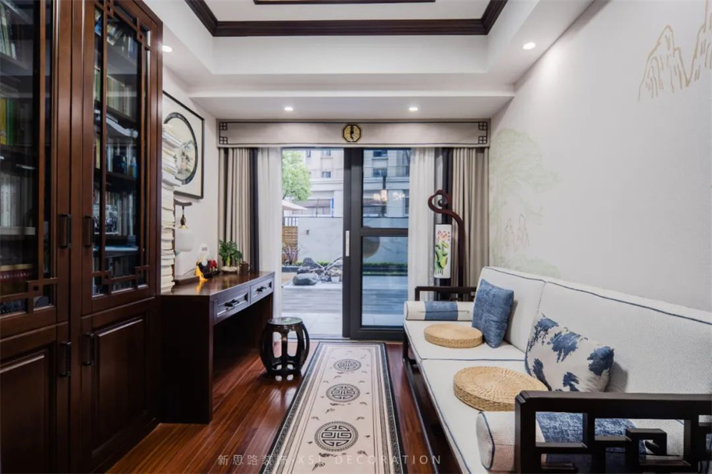 3、將臥室改為書房,書房到后花園打通做玻璃滑門,更方便;書房和客廳打通做鏤空隔斷,更通透。
