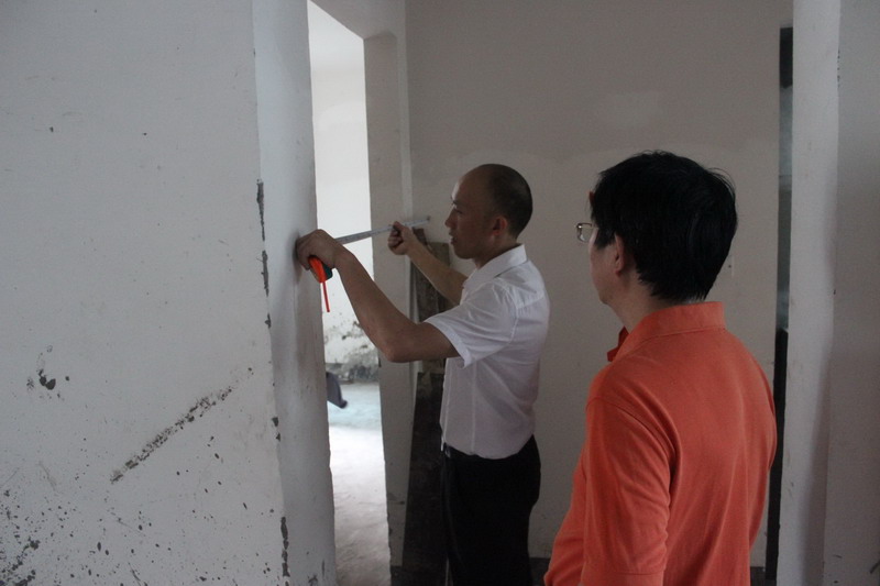 工程質(zhì)檢正在仔細(xì)檢查墻體有無空鼓情況。