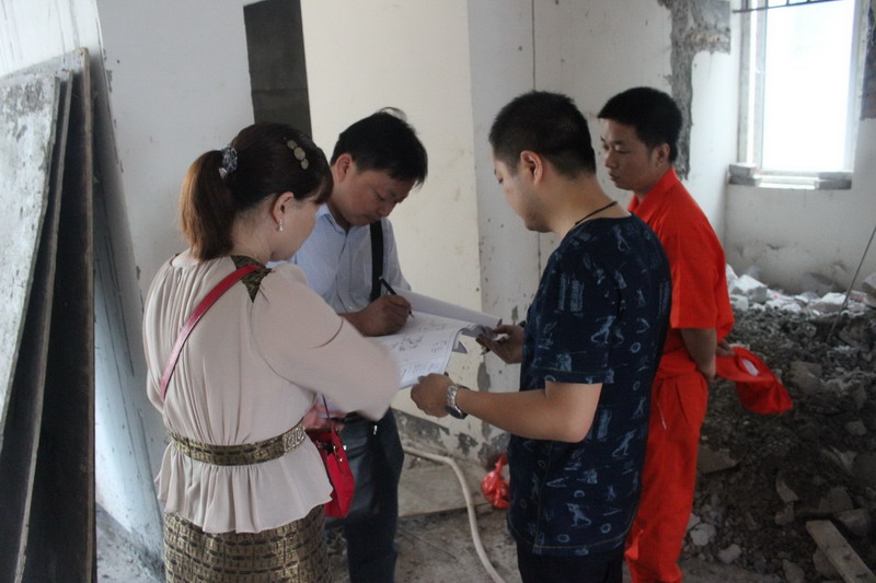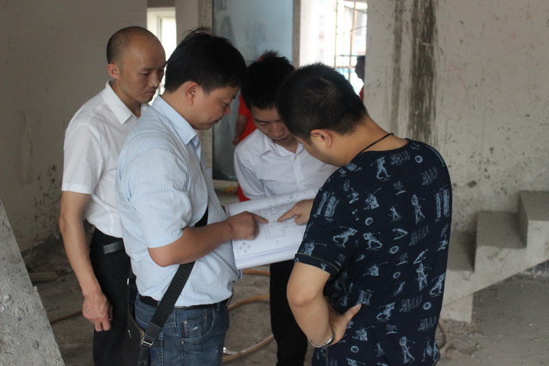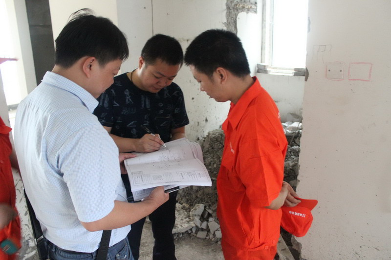 工長和工人師傅對照圖紙,認(rèn)真討論電線的排版、走位;插座組數(shù);強(qiáng)弱電箱安裝位置等細(xì)節(jié)。