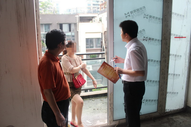 質(zhì)檢正在向潘老師夫婦介紹公司施工管理和服務(wù)的標(biāo)準(zhǔn)。新思路裝飾一直堅持“客戶滿意是唯一的工作標(biāo)準(zhǔn)”,努力踐行“裝修做客戶口碑”的理念,致力為每一位客戶提供高品質(zhì)的工程質(zhì)量和裝修服務(wù)。
