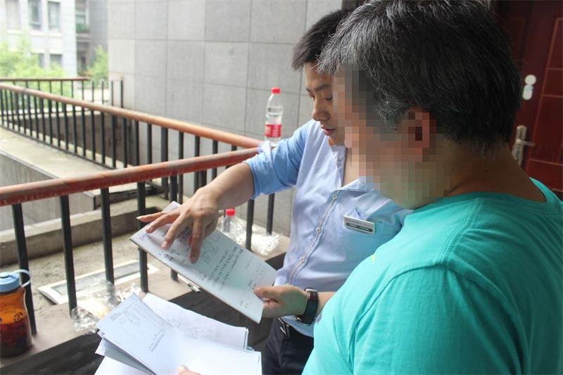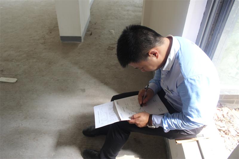 工程質(zhì)檢正在認真填寫客戶服務手冊,以確認本次進場交底符合公司工程施工管理的相關規(guī)定。