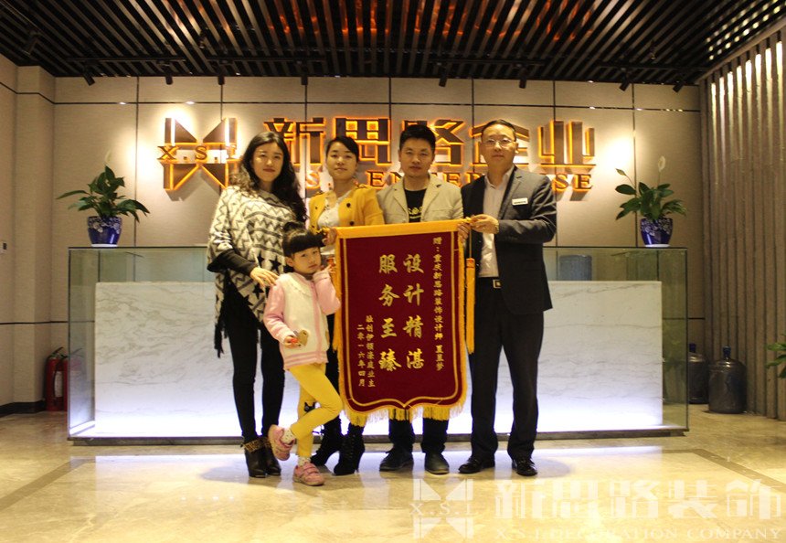 2016年4月24日上午,融創(chuàng)伊頓豪庭業(yè)主楊老師一家?guī)е幻娓兄x錦旗來到公司總部,錦旗上寫著:設(shè)計精湛,服務(wù)至臻!楊老師一家對新思路裝飾高品質(zhì)的裝修設(shè)計、服務(wù)表示深深的感謝。