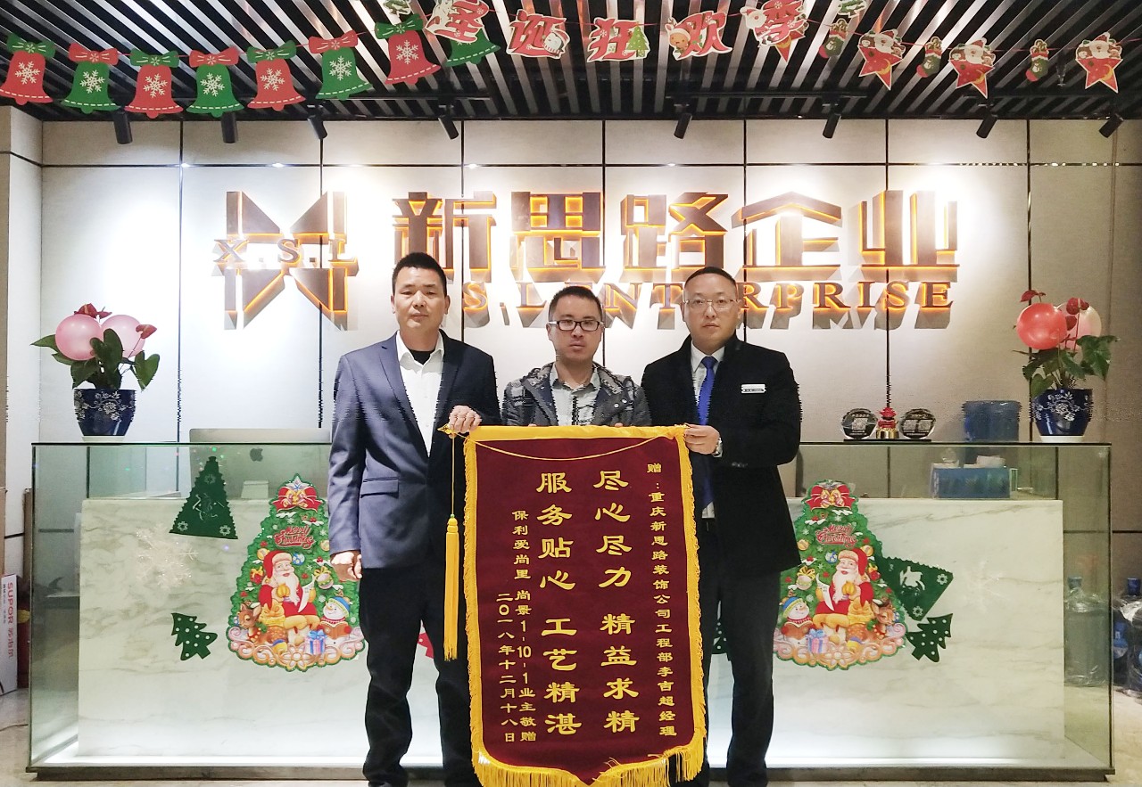 2018年12月24日下午,來自保利愛尚里·尚景的業(yè)主鐘老師專程來到南坪總部,將一面印有“盡心盡力,精益求精,服務貼心,工藝精湛”的錦旗交給我們的項目經理李經理手中,以感謝新思路裝飾高品質工藝和優(yōu)質貼心的家裝服務。