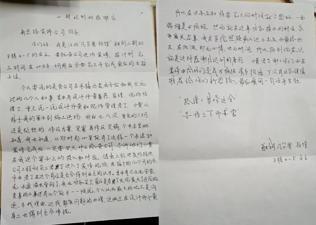 張老師說:“其實(shí)這個(gè)面錦旗和感謝信在2018年年初的時(shí)候都寫好了,過了大半年才送過來,也是因?yàn)橐恍┦虑?,所以現(xiàn)在才送來。主要是想感謝設(shè)計(jì)師小黃和項(xiàng)目經(jīng)理老丁,小黃從接手我的案子到施工進(jìn)場,忙前忙后,修改方案、定案、再修改定稿,特別是7、8月份的重慶天氣那么炎熱,這其中的辛苦,我也是知道的,就特別感謝小黃對我這個(gè)案子的投入與付出。還有項(xiàng)目經(jīng)理老丁在這個(gè)崗位是充分得到了我的認(rèn)可。個(gè)人認(rèn)為最大的優(yōu)點(diǎn)是溝通、不找理由和及時(shí)解決問題的態(tài)度,讓我特別滿意,下次有業(yè)務(wù)繼續(xù)推薦給你們新思路。”(張老師在去年工程完工后就把他朋友推薦給了我們,很感謝張老師的信任與認(rèn)可。)最后張老師借用了一句話來共勉:“路漫漫其修遠(yuǎn)兮,吾將上下而求索”。再次感謝張老師對我們新思路裝飾的認(rèn)可與信任。