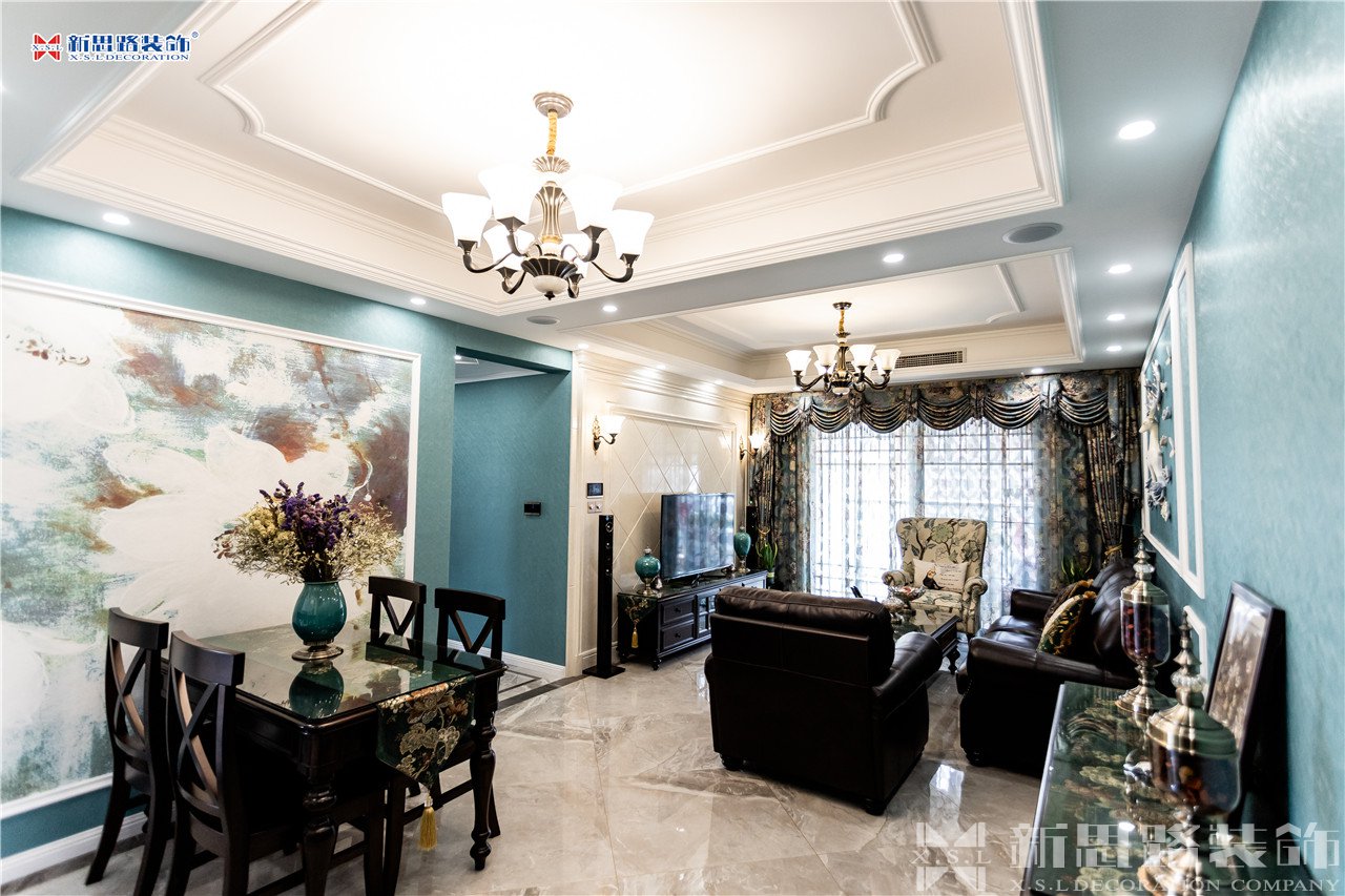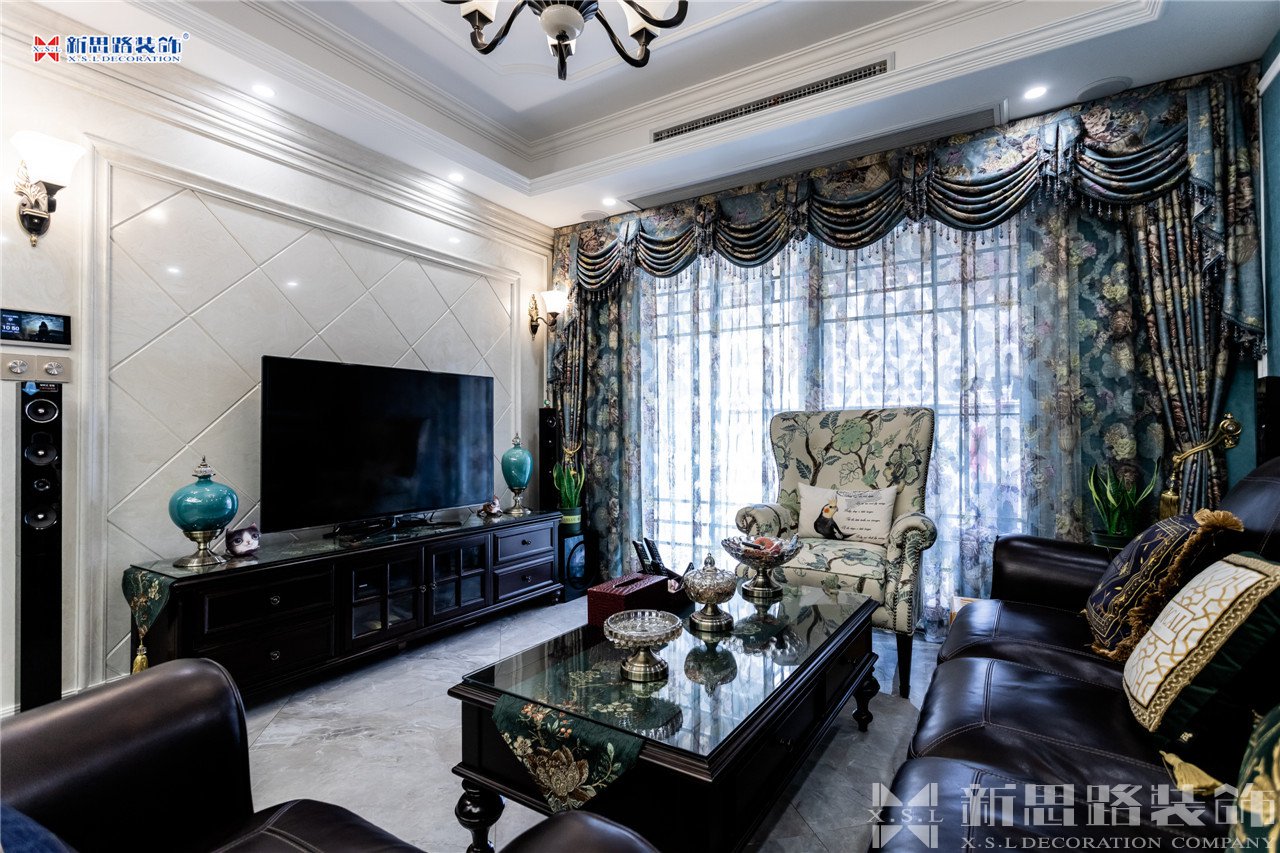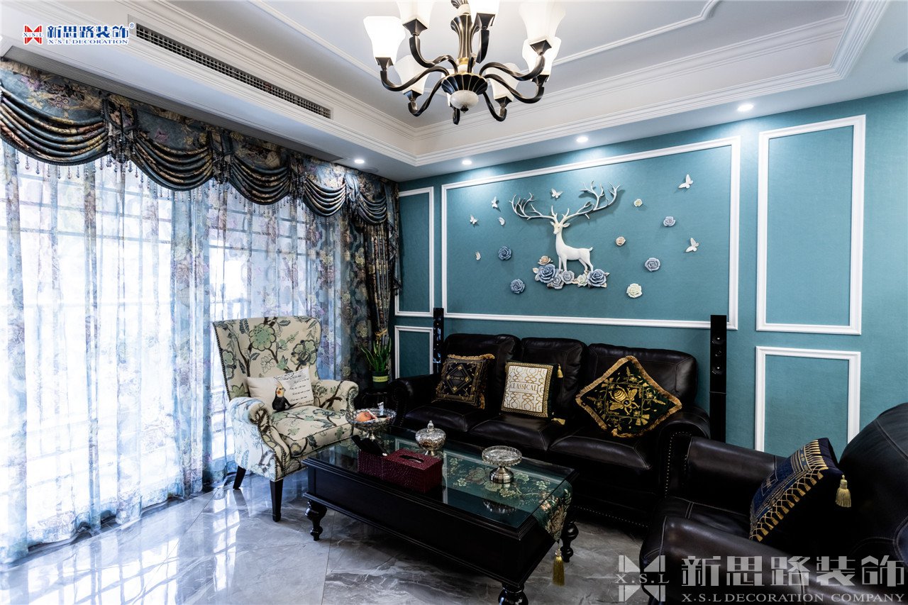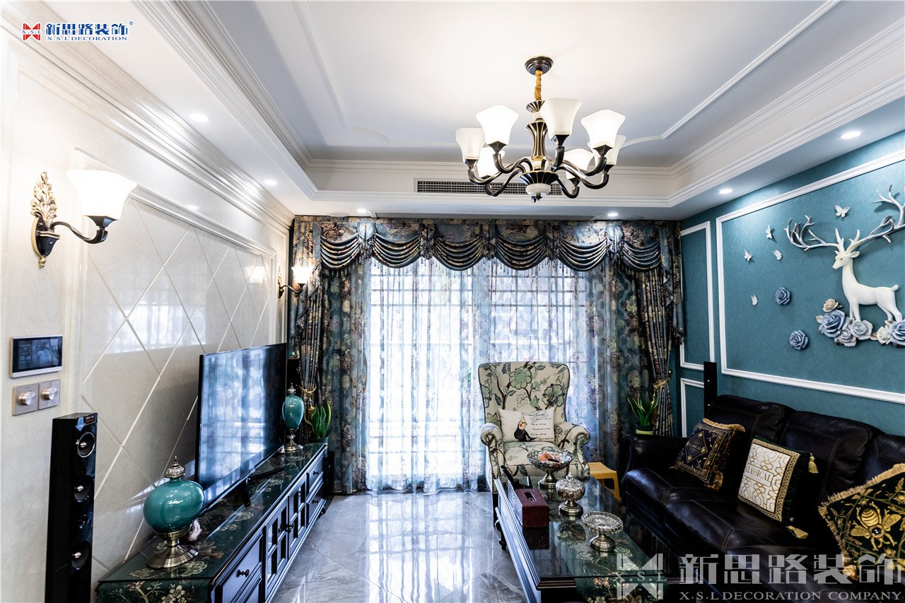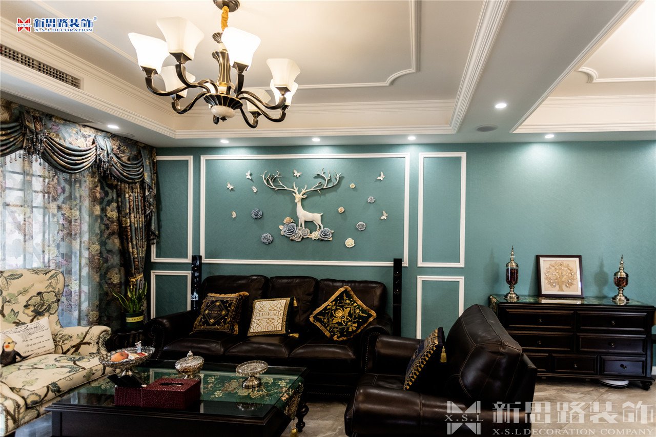沙發(fā)背景墻使用石膏線材勾畫(huà)幾何圖形,古典優(yōu)雅;陶瓷的小鹿漫步花間,野趣橫生。復(fù)古花色的窗簾與真皮質(zhì)地的沙發(fā)以及實(shí)木電視柜搭配起來(lái)正合適,線條分割成菱形網(wǎng)格狀的乳白色電視背景墻大方低調(diào),黃銅色美式吊燈干凈明亮。深墨綠色的織錦桌旗無(wú)形中又添了點(diǎn)奢華意味,油青色的仿古裝飾擺件也是非常經(jīng)典的美式元素體現(xiàn)。