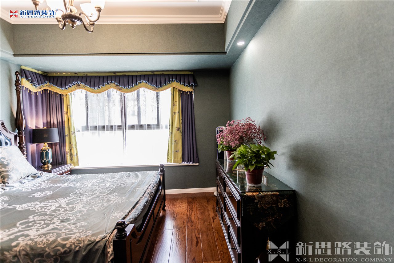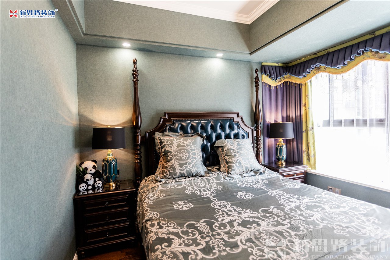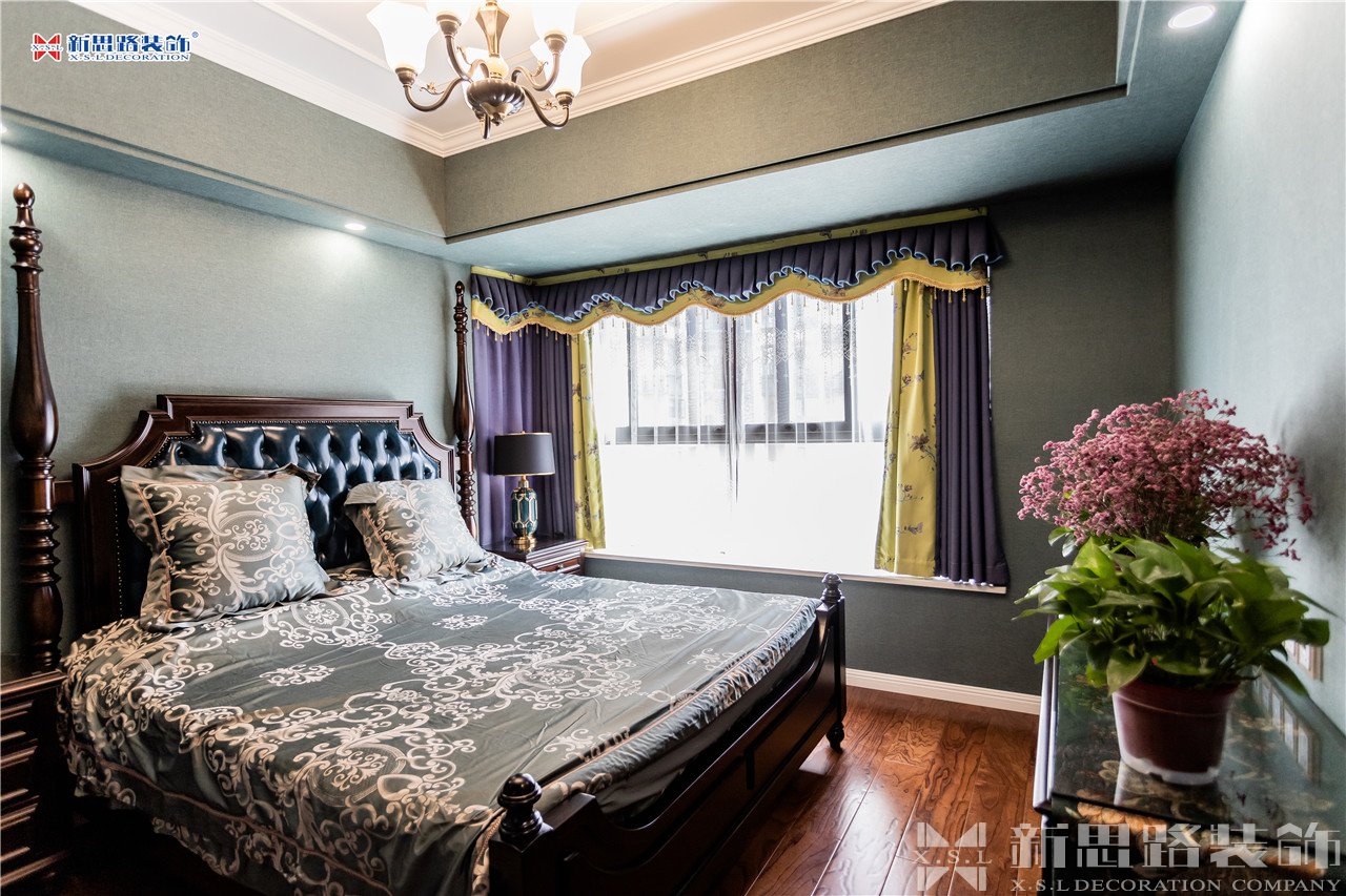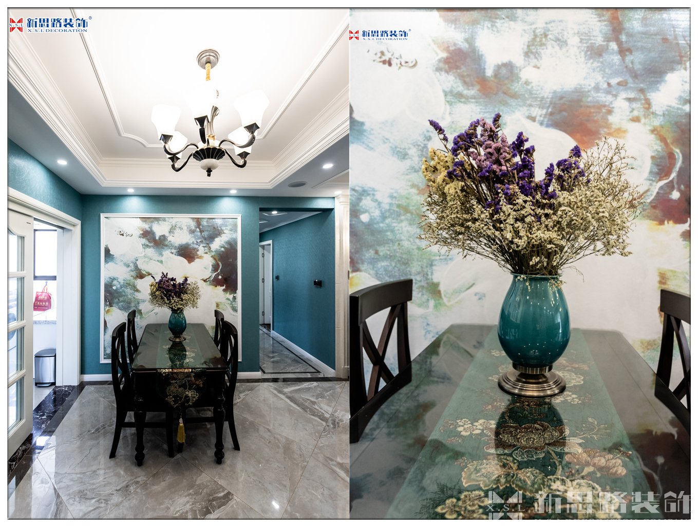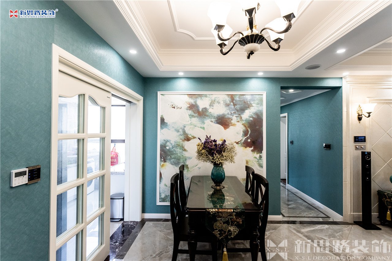 沙發(fā)背景墻使用石膏線材勾畫(huà)幾何圖形,古典優(yōu)雅;陶瓷的小鹿漫步花間,野趣橫生。復(fù)古花色的窗簾與真皮質(zhì)地的沙發(fā)以及實(shí)木電視柜搭配起來(lái)正合適,線條分割成菱形網(wǎng)格狀的乳白色電視背景墻大方低調(diào),黃銅色美式吊燈干凈明亮。深墨綠色的織錦桌旗無(wú)形中又添了點(diǎn)奢華意味,油青色的仿古裝飾擺件也是非常經(jīng)典的美式元素體現(xiàn)。