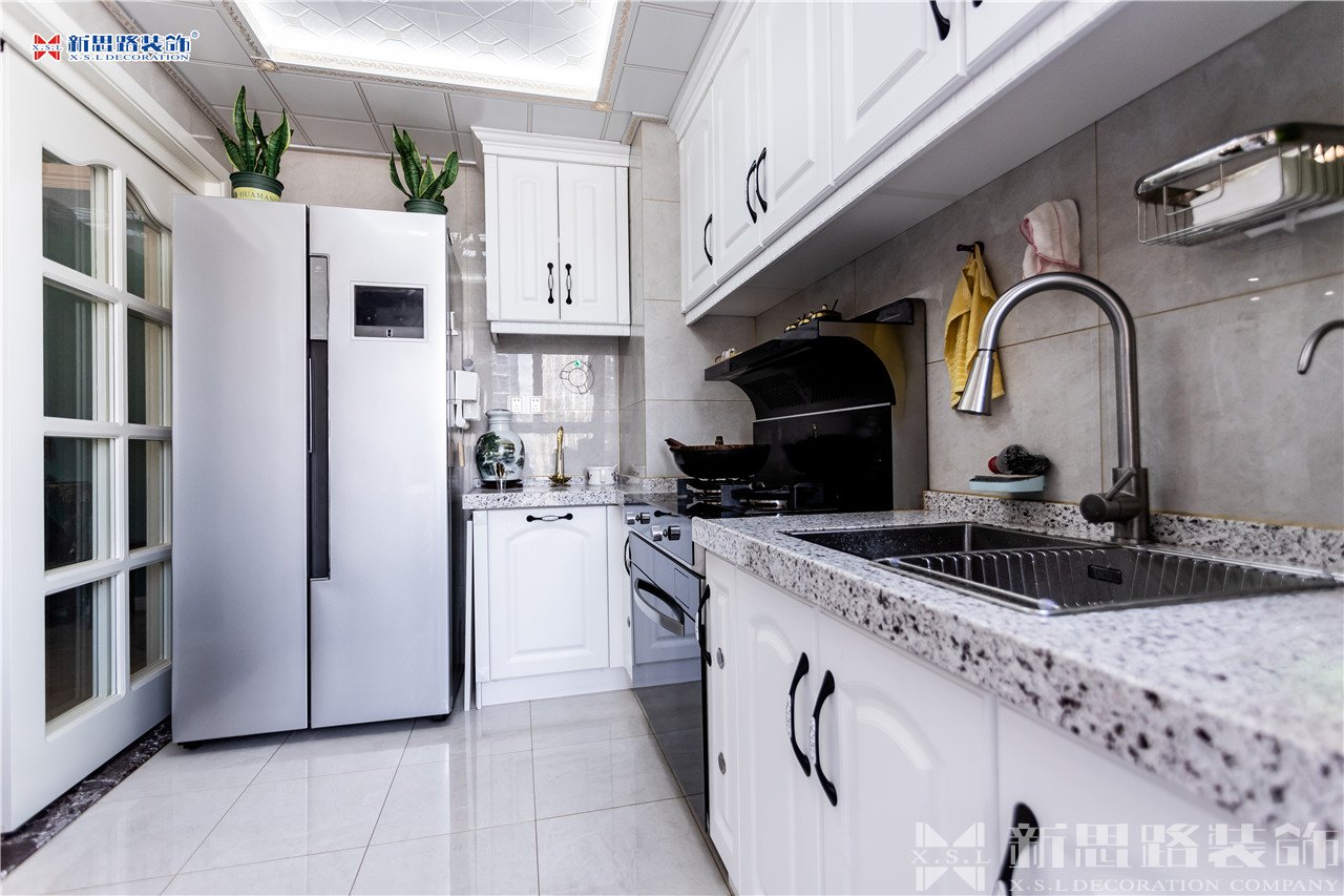 廚房灶臺(tái)使用白色大理石材質(zhì)打造,料理臺(tái)的設(shè)計(jì)更方便食物的制作。櫥柜顏色也選取了同色系的白色,清新干凈,讓本是油煙滿滿的廚房視覺(jué)上看起來(lái)明亮整潔。