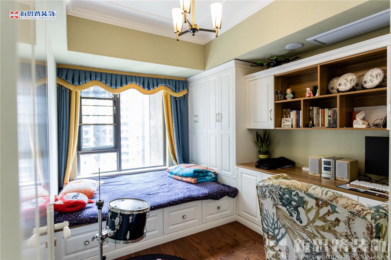 次臥是帥氣兒子的房間。學(xué)生難免書(shū)籍和雜物較多,床鋪采用榻榻米的設(shè)計(jì)更便于物品收納,長(zhǎng)條形的書(shū)桌在擺放電腦后仍留有許多空間。書(shū)架近在咫尺,手邊是舊式磁帶播放器,心愛(ài)的架子鼓就在身后,音樂(lè)夢(mèng)想和學(xué)習(xí)并不沖突,小小的空間滿載的是青春的律動(dòng)。