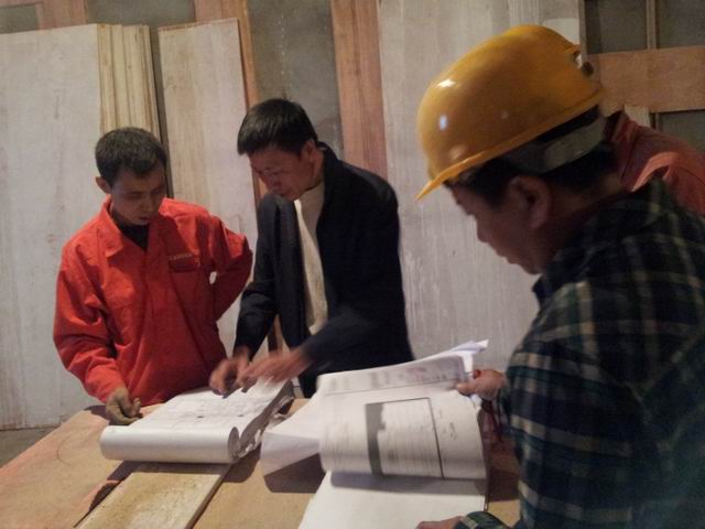 公裝部譚經(jīng)理正在和電工班組和木工班組討論施工細節(jié)