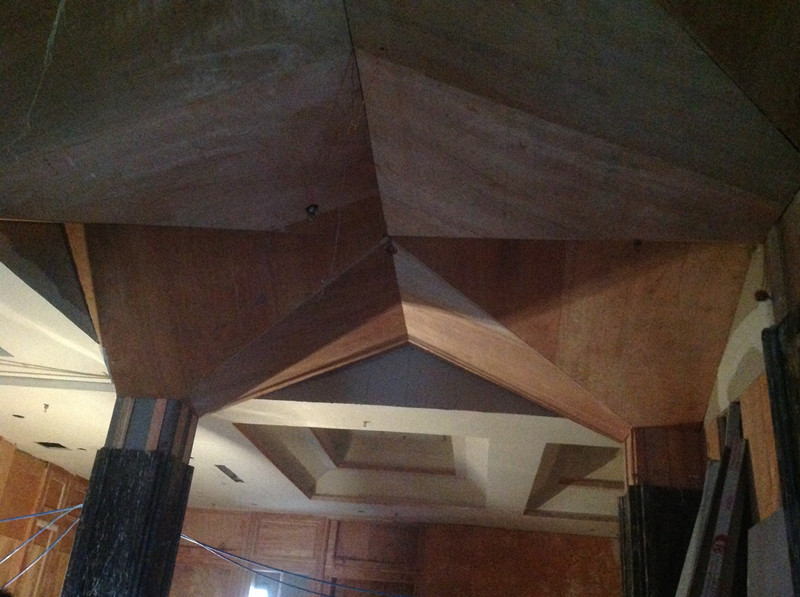 譚經(jīng)理在向設(shè)計(jì)師介紹木工吊頂工藝細(xì)節(jié)