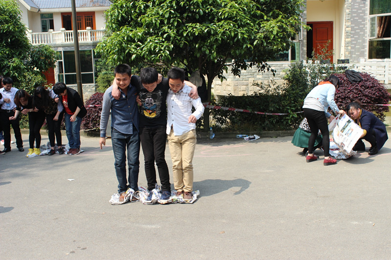 以“同舟共濟(jì)”游戲為例,游戲以小隊為單位,每隊派出3名隊員參賽,用報紙膠帶動手制作用來渡河的“舟”,制作好后3人站在“舟”上同心協(xié)力從起點到達(dá)終點。每個隊的造舟時間為五分鐘,時間到即停止造舟開始比賽,哪個小隊最先完成比賽即算勝利。這個游戲重點考驗團(tuán)隊成員的協(xié)作性和默契度,細(xì)節(jié)決定成敗,一旦失誤就會對其他隊員造成直接影響。游戲過程中每位隊員分工合作,各司其職,團(tuán)結(jié)一致,充分發(fā)揮集體智慧,為了共同的目標(biāo)而拼盡全力。
