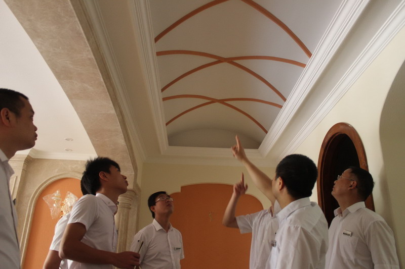 在雅居樂39-2工地。該別墅設(shè)計(jì)師——南坪店楊店長向大家詳細(xì)講解了電視墻、頂面造型的設(shè)計(jì)技巧以及相關(guān)材料的使用等知識(shí)。大家也依據(jù)自身所學(xué)和相關(guān)施工經(jīng)驗(yàn),大膽提出自己的設(shè)計(jì)見解。工地大巡查不光確保了工程品質(zhì),同樣也拓寬了設(shè)計(jì)視野,為提升各店設(shè)計(jì)實(shí)力打下了堅(jiān)實(shí)的基礎(chǔ)。