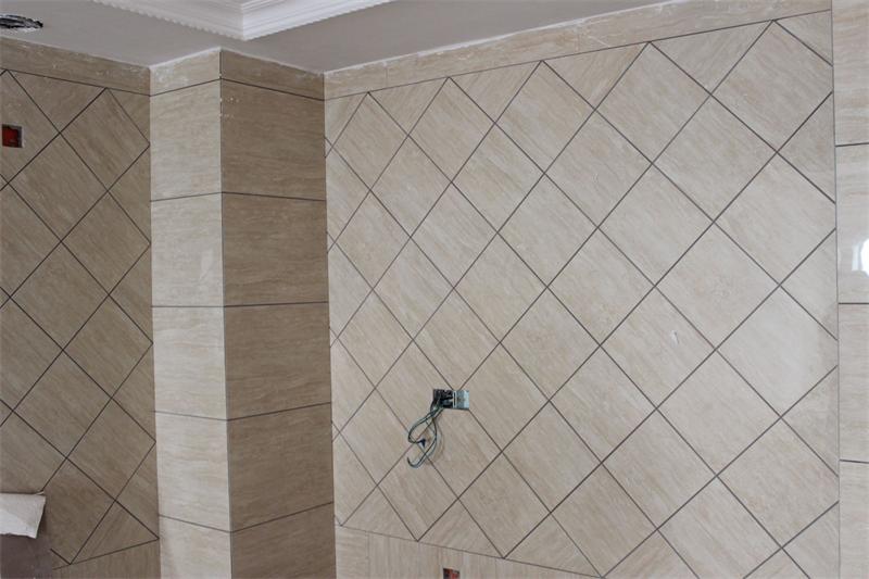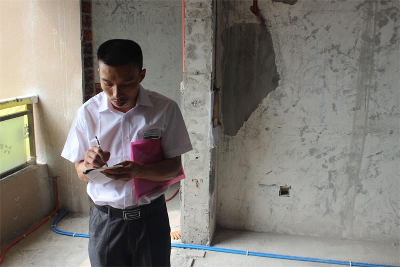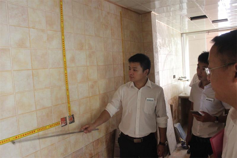 片區(qū)張經(jīng)理正在認(rèn)真檢查墻面貼磚情況