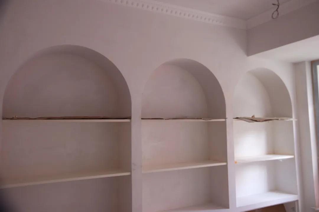 第三個工地正在硬裝進行中。這套案例設計上的巧思和花樣比較多,類似浮雕的花紋已經做好造型,等待燈具的安裝;衛(wèi)生間的墻面也完成了,如同馬賽克的六邊形花紋拼貼低調中透露出一絲藝術性,拱門般的柜架設計還帶來不少別樣風情。相信在不久之后,這里會是客戶溫暖而美麗的家。